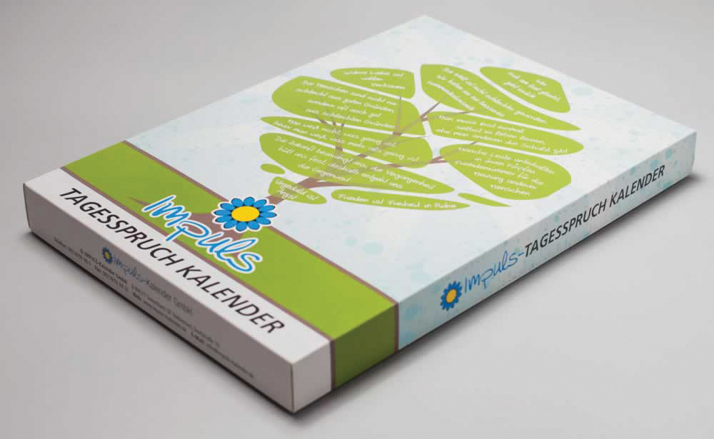Als schönes Extra erhalten Sie auf der Blattrückseite des Tagesspruch-Kalenders zusätzlich die englische Übersetzung des Leitspruchs, alle Angaben zum Spruchautor sowie die Nennung der Namenstage und Mondphasen. Ein von Ihnen individuell gewähltes, kostenloses Jahresmotto in Form einer Standard-Kopfleiste am Kopf des Wandkalenders gibt zusätzliche Motivation zum neuen Tag. Gerne wird dieser beliebte Zitate-Kalender auch verschenkt: Von Mensch zu Mensch, aber auch von Firmen wird er als eindrucksvolles Werbegeschenk geschätzt. Die Möglichkeiten zur Individualisierung sind vielfältig und kostenlos! Seien Sie versichert, dass Sie auf jeden Fall ein außergewöhnliches und äußerst gerne gesehenes Geschenk überbringen, wodurch Sie beim Beschenkten ein ganzes Jahr lang in bester Erinnerung bleiben. Der IMPULS-Kalender wird gerne an zentraler Stelle im Büro platziert, und die Sprüche laden nicht selten zu einem kurzen Gespräch unter Kollegen ein; er fördert somit auch ein gutes Betriebsklima.