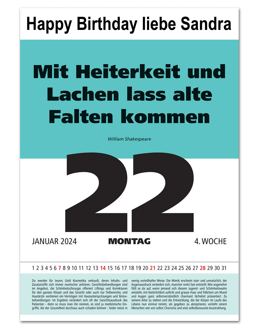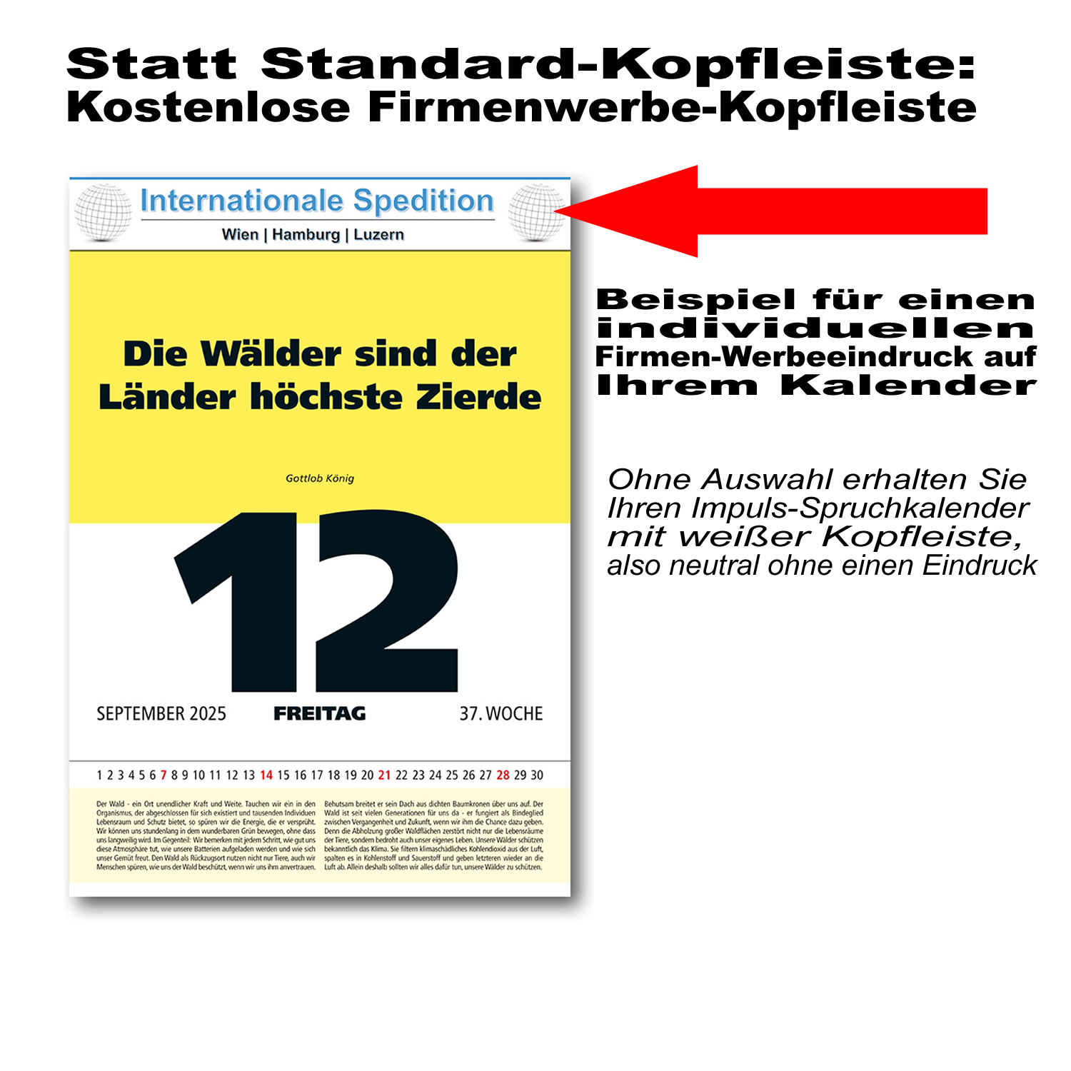 Der IMPULS-Sprüchekalender 2026 für jeden Tag hat ein weithin sichtbares Riesendatum und ein Gesamtformat von 27,5 x 39,5 cm. Seine auch auf große Distanz noch sehr gut lesbaren Zitate geben Ihnen das ganze Jahr über wertvolle Denkanstöße. Beginnen auch Sie den Tag mit einer inspirierenden Lebensweisheit aus dem IMPULS-Tagesspruch-Kalender. Auf der Rückseite des Kalenderblattes befinden sich die Kurzdaten des jeweiligen Spruchautors sowie eine englische Spruchversion. Mit der Angabe von Namenstagen und dem Aufzeigen der Mondphasen der jeweiligen Woche wird das Profil des Wandkalenders abgerundet. Samstag und der Sonntag teilen sich ein Blatt mit einem schönen Spruch. Mit einer kostenlosen Standard-Kopfleiste (abgebildet zum Beispiel ist die Nr. 30) wird der Impulskalender zu Ihrem persönlichen "Beginne jeden Morgen mit einem Guten Gedanken"-Kalender. Statt mit einem Standard-Kopfleistenspruch können Sie diesen Abreißkalender auf 27,5 x 4 cm mit Ihrem einprägsamen Firmen-Werbeeindruck oder Ihrem eigenen Motto (bei Privatpersonen) kostenlos individuell bedrucken lassen. Sie erhalten somit das perfekte Werbegeschenk für Ihre Kunden. Bitte beachten Sie hierzu die Informationen unter Werbe-Eindruck/eigenes Motto >>
