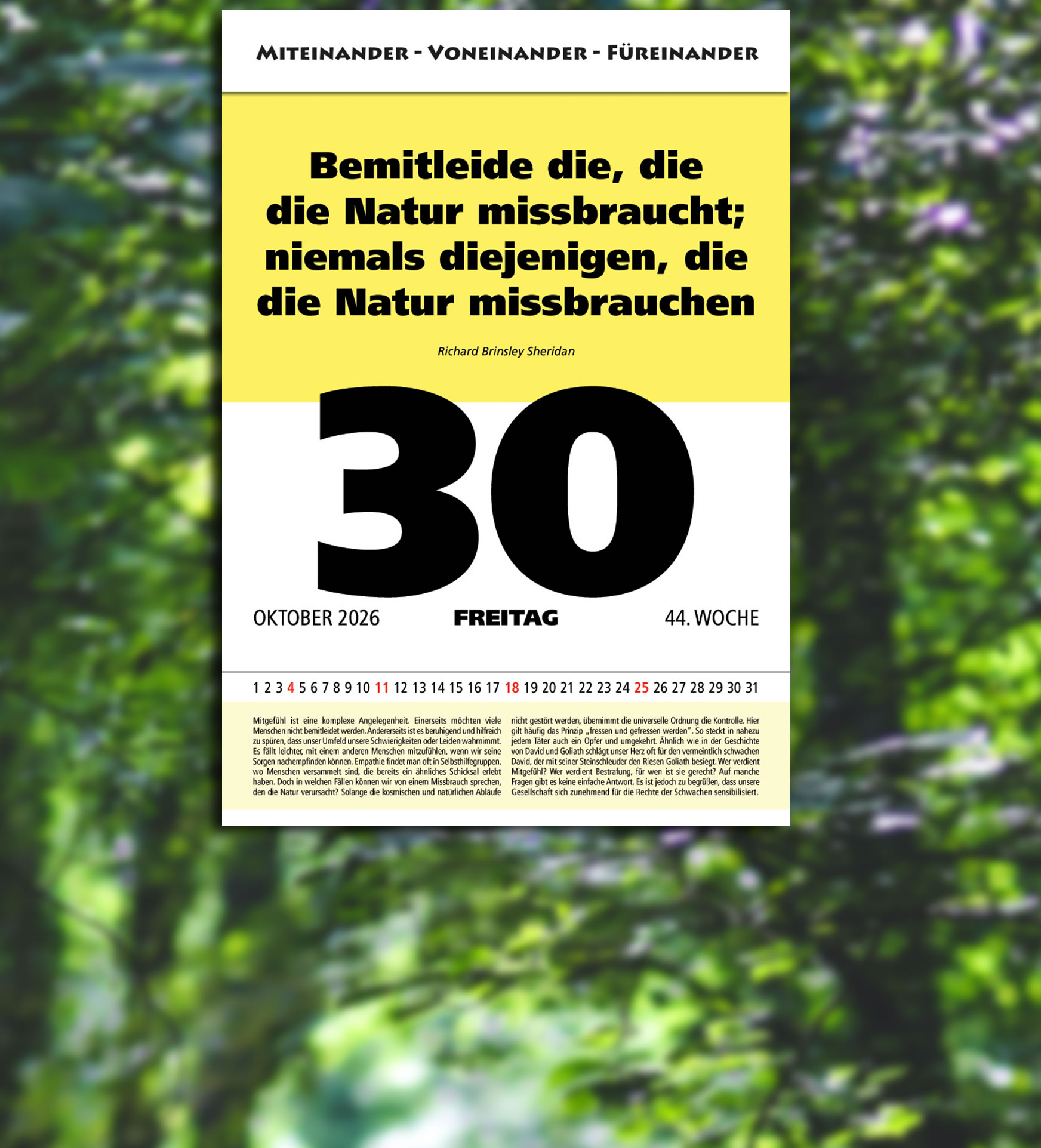 Durch den Kauf des Kalenders tragen auch Sie zur Erhaltung unserer Umwelt bei. Die Entsprechung der PEFC-Kriterien garantiert, dass Papierprodukte aus nachhaltig bewirtschafteten Wäldern stammen. PEFC ist die größte Institution zur Sicherstellung und Vermarktung nachhaltiger Waldbewirtschaftung durch ein unabhängiges Zertifizierungssystem.